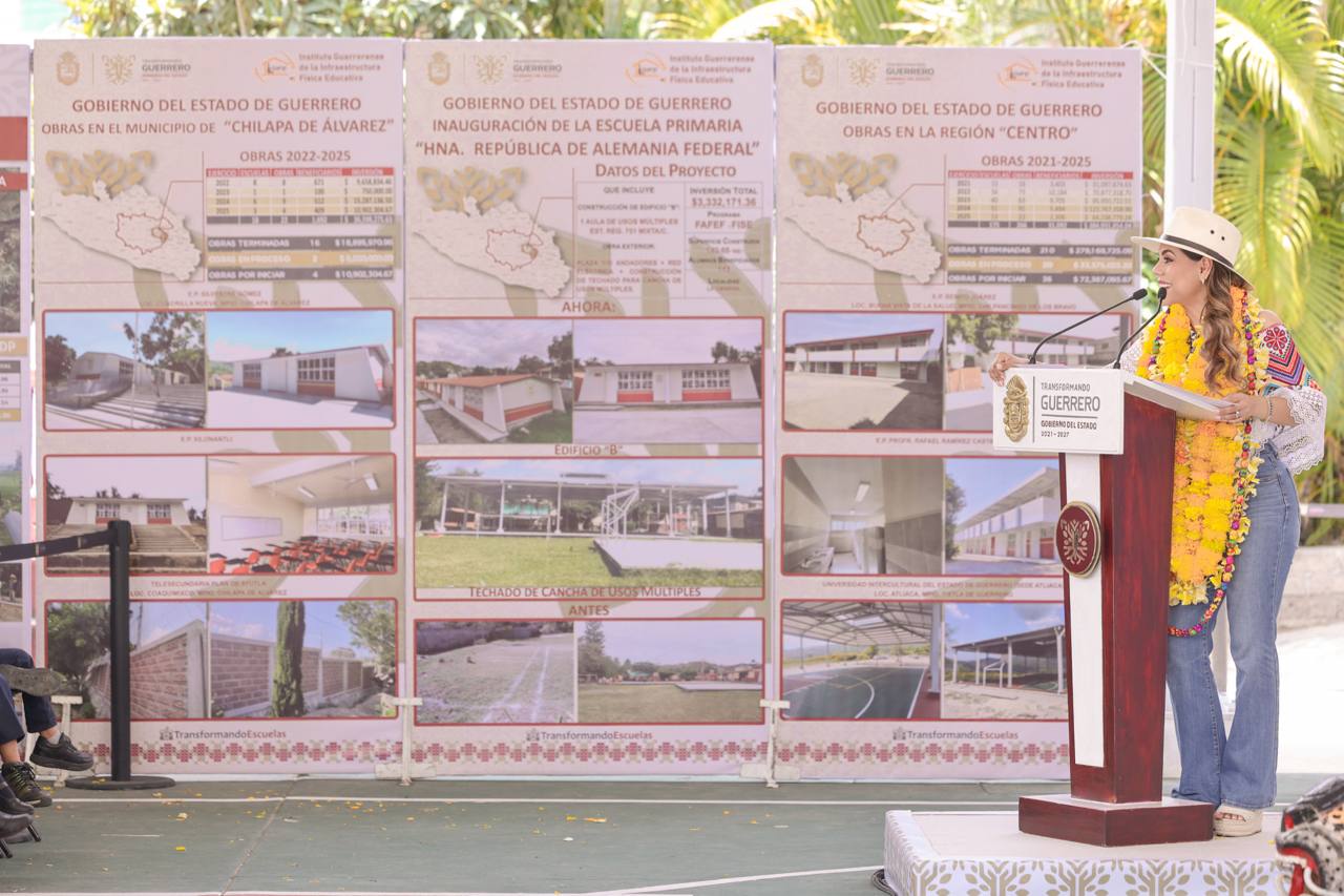 Con una inversión de 3.3 millones de pesos, la gobernadora Evelyn Salgado Pineda inauguró la construcción de un aula de usos múltiples, obra exterior y el techado de la cancha de basquetbol en la Escuela Primaria “Hermana República de Alemania Federal”, ubicada en la comunidad de La Ciénega, municipio de Chilapa.