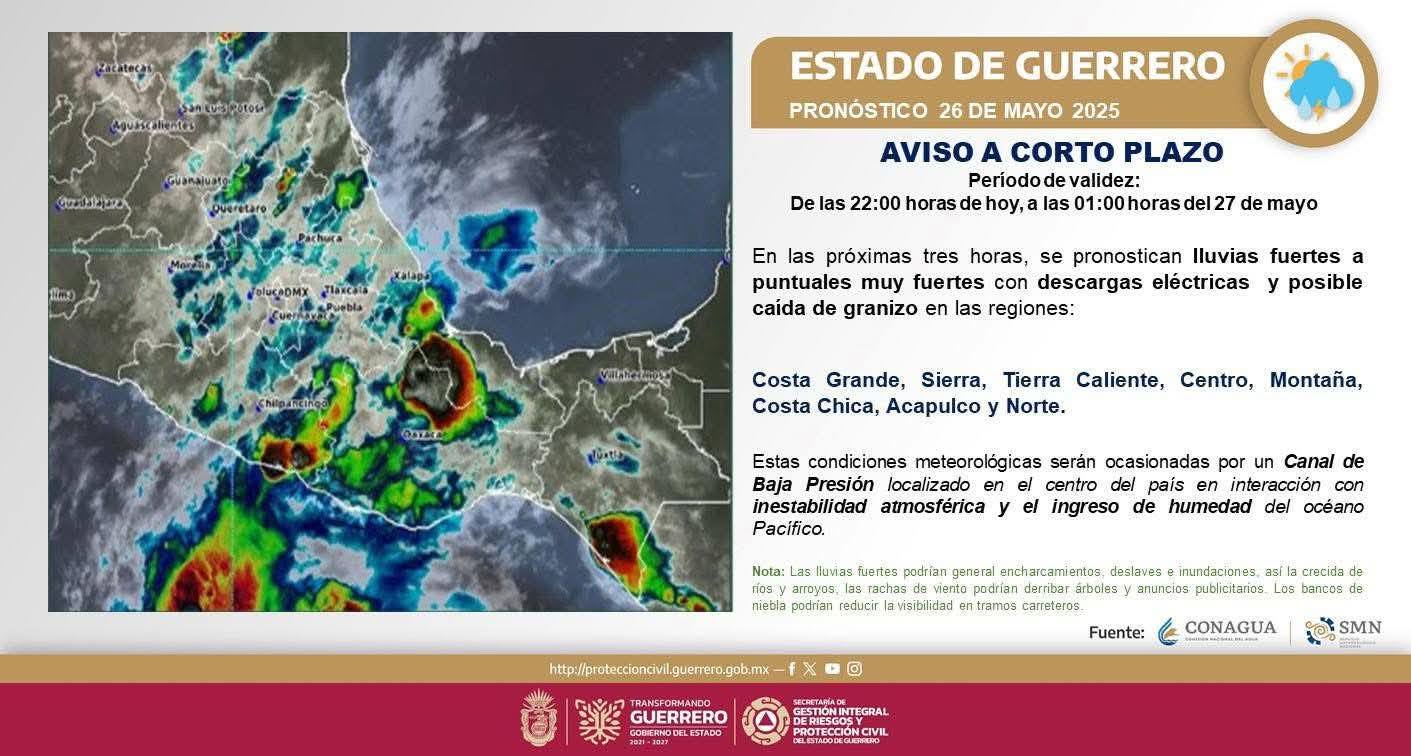 La Secretaría de Gestión Integral de Riesgos y Protección Civil Guerrero (SGIRPCGRO) informó que, durante la noche de este miércoles 04 de junio y la mañana del jueves 05 de junio, se pronostican lluvias muy fuertes en el estado.